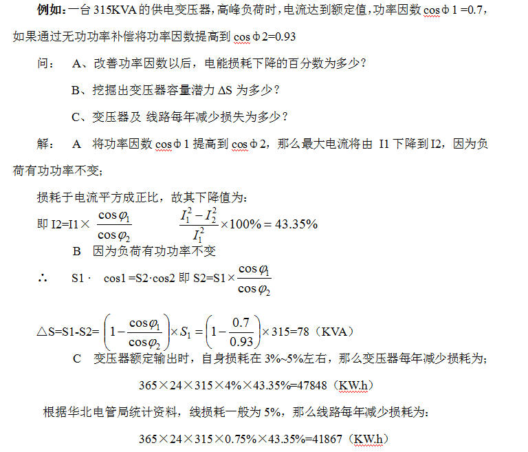 If there is insufficient capacity in transformers and lines, the method of installing reactive power compensation devices can be used. Installing reactive power compensation devices can balance reactive power locally, reducing the current flowing through lines and transformers, slowing down the aging speed of wire and transformer insulation, and extending their service life. At the same time, it can release the capacity of transformers and lines, increasing their load-carrying ability. For example, with a 100KVA transformer currently operating at 85% load with a COSΦ of 0.7, installing reactive power compensation equipment can increase the transformer's load-carrying capacity by 30%. Users can increase their load without expanding capacity to facilitate further production expansion.
