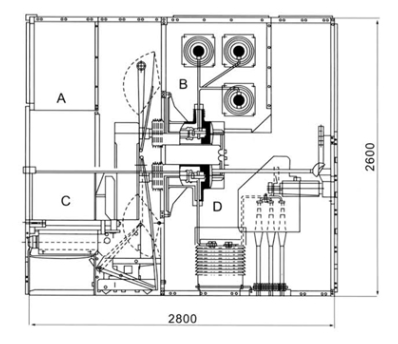 | Dimensions (WxDxH): 1400x2800x2600 | Schematic diagram of the structure of the මාරුකරු A. relay instrument room B bus room C circuit breaker room D cable |