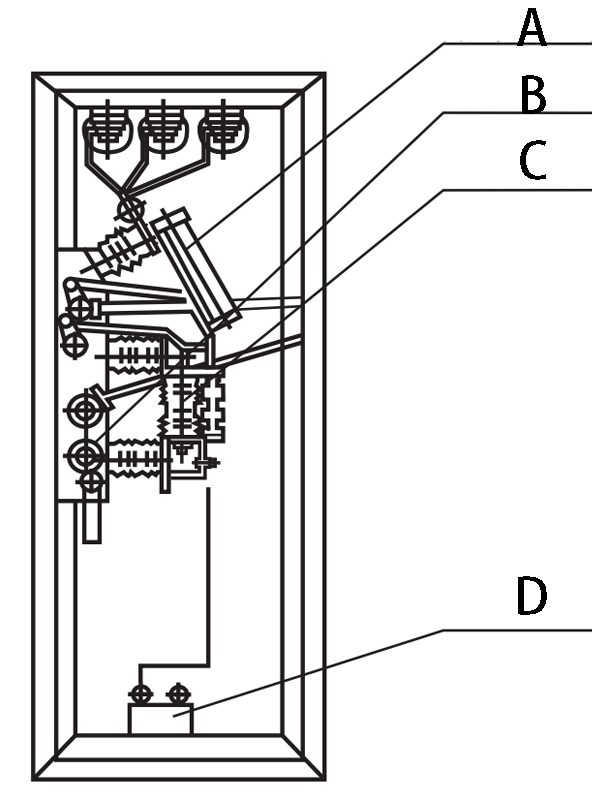 ![]() | Figure 2 A.: Insulator B: Through the wall casing C: Operating mechanism D: Grounding switch |